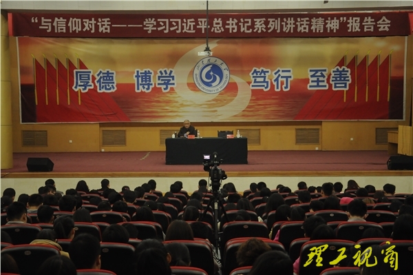 本网讯 4月9日下午,我校邀请山东省委讲师团副团长何克亮教授在3号教学楼报告厅作“与信仰对话——学习习近平总书记系列讲话精神”报告会,深度解读中国梦,全面阐释习近平总书记系列讲话精神。全校各级团干部共计400余人现场聆听了报告。