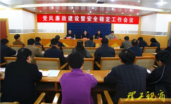 本网讯 4月10日下午,学校在鸿远楼一楼报告厅召开党风廉政建设暨安全稳定工作会议,部署安排2015年党风廉政建设和安全稳定工作。校党委书记都光珍主持会议并讲话。校党委副书记、纪委书记衣玉琛,副校长杜瑞成、张祥云出席会议,各部门、单位负责人,各学院党总支(党委)书记、院长,后勤各实体单位负责人参加会议。