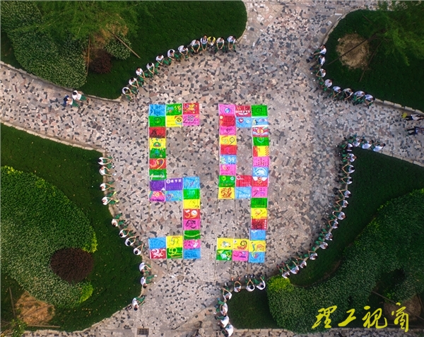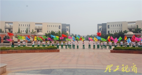 59面由各级学生组织精心绘制、富有自身特色的彩旗在同学们手中整齐有力地挥舞,沿环绿岛路奔跑,在校园内形成了一道靓丽的风景线,舞出风采,舞出自信。