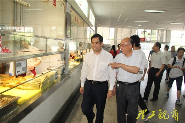 当日12时,正值午间就餐高峰时段,吕传毅一行选择学生就餐较为拥挤的第三食堂一楼,加入到学生队伍中排队打饭,亲身体验就餐情况,并与学生同桌进餐,亲切交流。吕传毅认真听取了学生对于食堂就餐环境,服务质量,饭菜质量及价格,学生餐饮消费支出等情况的感受,重点对学生普遍关注的饭菜品种和低价菜供应情况进行了详细询问。