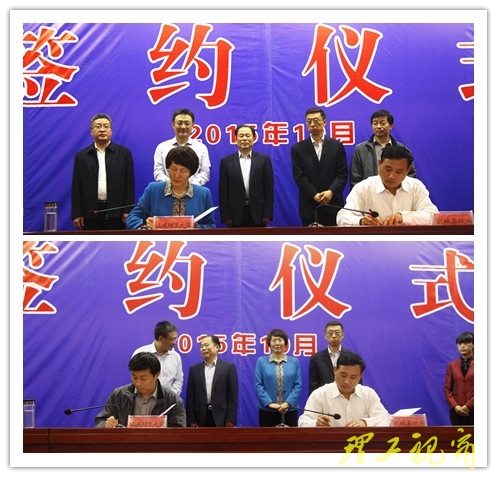 刘国华与王志强签订《山东理工大学——武城县人民政府战略合作协议》、科技处处长魏修亭与王志强签订《成立山东理工大学武城产业创新及机器人技术研究院合作协议》。