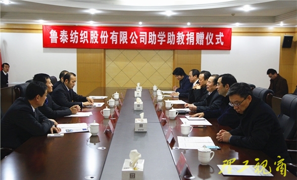 本网讯 【视频链接】12月23日,鲁泰纺织股份有限公司董事长刘子斌一行4人来到我校,向我校捐赠助学助教经费100万元人民币。校党委书记都光珍、校长吕传毅、副校长王学真出席捐赠仪式,相关部门、学院负责人参加仪式。