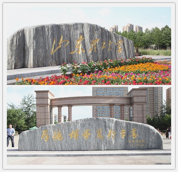 “迎门石”是威海校友会80余位校友,在母校喜迎60华诞之际,特别为母校捐款定制的泰山景观石,以表达对母校的爱戴之情。“迎门石”七米长一米半高,正面镌刻着毛体“山东理工大学”,背面镌刻着欧阳中石题写的“厚德博学笃行至善”校训。