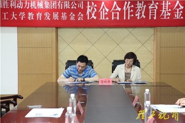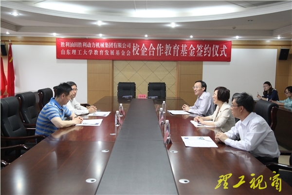 本网讯 5月26日下午,胜利油田胜利机械集团有限公司在山东理工大学教育发展基金会设立校企合作教育基金首期50万元,签约仪式在鸿远楼九楼会议室举行。胜利动力机械集团有限公司执行总经理兼总工程师、校友张国昌,副校长、山东理工大学教育发展基金会副会长刘国华出席仪式并分别致辞,相关部门、学院负责人参加仪式。