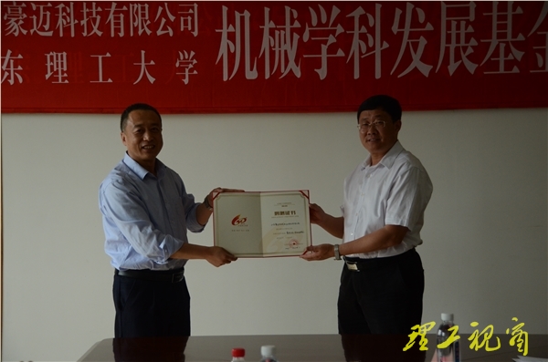 张伟代表豪迈公司向学校捐资10万元人民币,衣玉琛代表学校接受捐赠并向张伟颁发了捐赠证书。