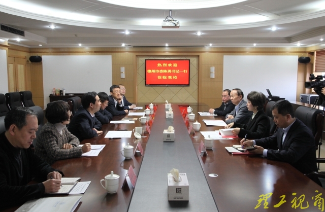 本网讯 3月27日上午,德州市委书记陈勇,市委常委、政法委书记杨玖庆,市委常委、秘书长刘长民等一行4人来校考察调研。校党委书记吕传毅、校长张铁柱、副校长刘国华在鸿远楼九楼会议室会见了客人,并进行座谈。