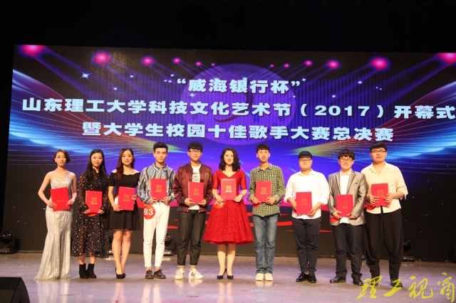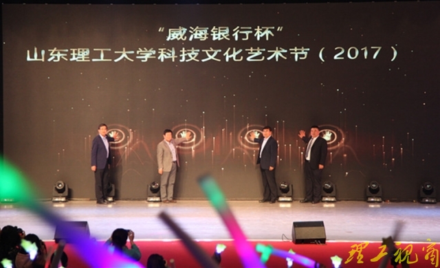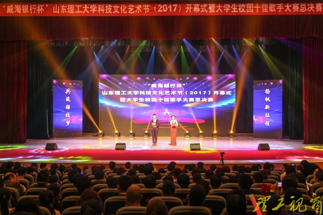 本网讯 灯光闪烁,歌声飞扬。4月21日晚,大学生艺术中心礼堂座无虚席、欢声如潮,“威海银行杯”山东理工大学科技文化艺术节(2017)开幕式在此隆重举行,本届科技文化艺术节活动之一——大学生校园十佳歌手大赛总决赛同时举行。校长张铁柱,校党委副书记胡兴禹,校党委常委、副校长张祥云,威海市商业银行淄博分行行长王希峰出席开幕式,与各部门、学院负责人及广大师生一同观看了精彩演出。