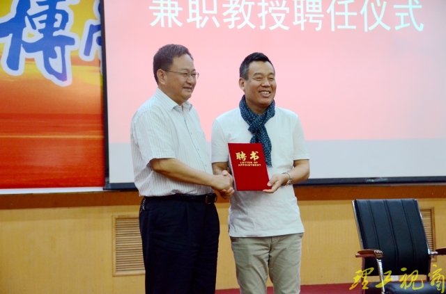 讲座前,学校举行了兼职教授聘任仪式,王立斌为刘彦湖颁发聘书,聘任刘彦湖为我校兼职教授。