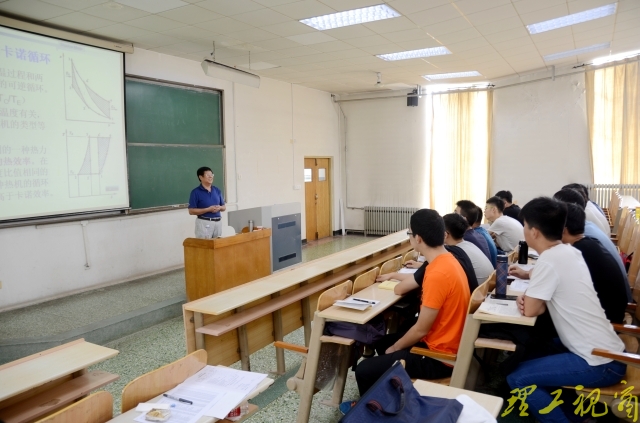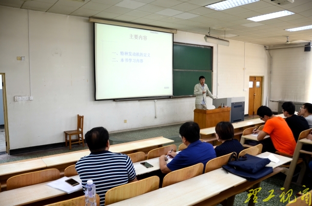 与此同时,4号教学楼305教室内,校长张铁柱正在听2014级能动卓越班的“特种发动机绪论”课程。任课教师交通与车辆工程学院郭鹏江老师向学生们介绍了课程主要内容、课程结构和学习方法,重点讲解了特种发动机的分类和热气机的工作原理。虽然刚刚经历了漫长的暑假,但学生们都能及时收心于课堂,跟着老师的授课思路,听得分外专注认真。