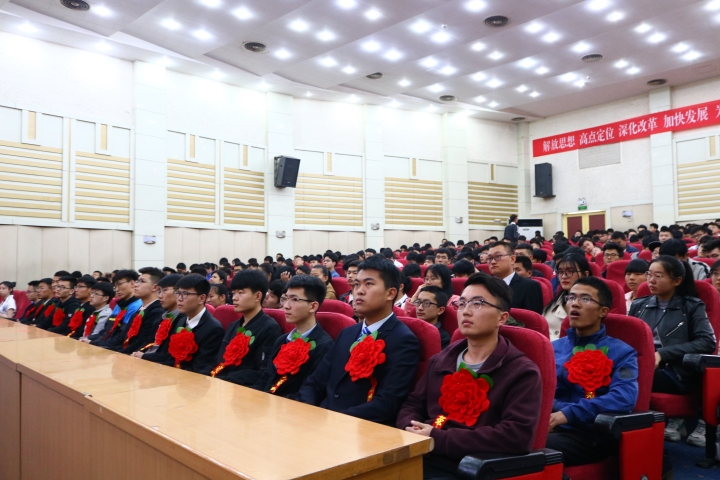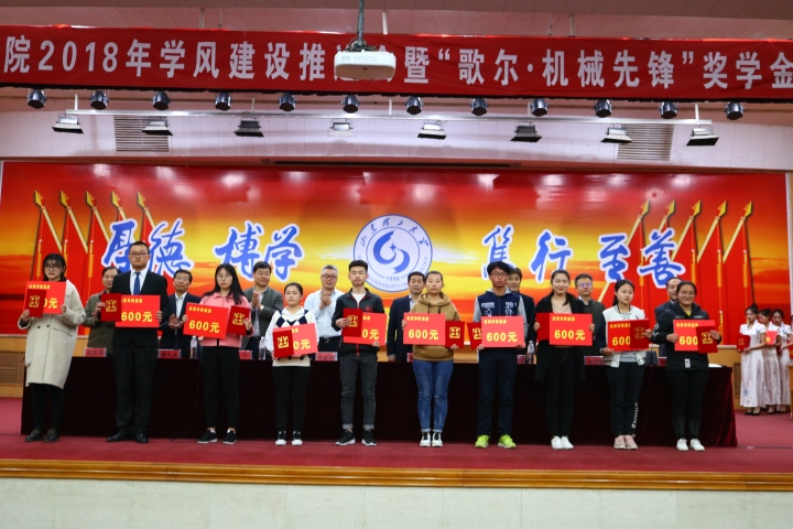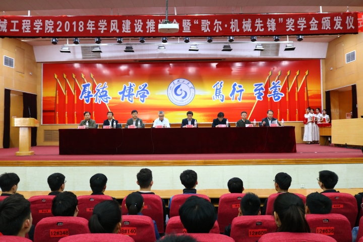 本网讯 3月29日下午,机械工程学院在3号教学楼报告厅举行2018年学风建设推进会暨“歌尔·机械先锋”奖学金颁发仪式。校党委常委、副校长魏修亭出席活动,歌尔股份有限公司事业部负责人,学校教务处、学生工作处、机械学院负责人,获奖学生和学生代表参加活动。