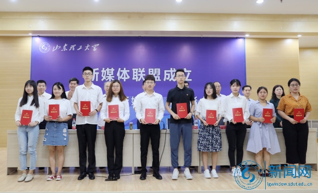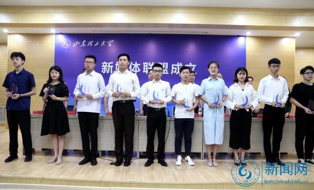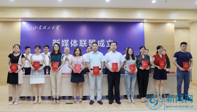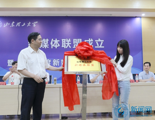 在热烈的掌声中,吕传毅和新媒体运营学生代表李欣雨共同为“山东理工大学新媒体联盟”揭牌。
