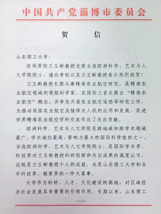 贺信说,欧洲科学、艺术与人文学院是跨地域和跨学术领域最广、学术地位最高、影响力最大的国际科学组织之一,当选欧洲科学、艺术与人文学院院士,是国际学术界、科技界对兰玉彬教授科研创新和杰出成果的高度认可,这既是兰玉彬教授个人的成就,也是山东理工大学和全市科技界、教育界的一件大喜事。