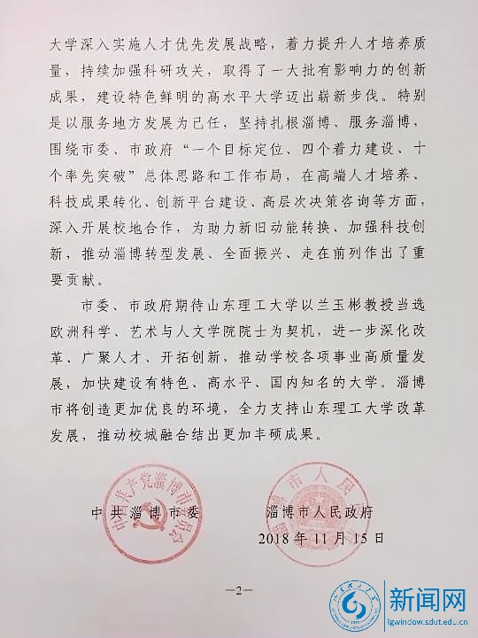 本网讯 11月15日,中共淄博市委、淄博市人民政府就我校兰玉彬教授当选欧洲科学、艺术与人文学院院士一事专门向我校发来贺信。