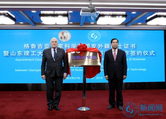 仪式上举行了山东理工大学—格鲁吉亚国家科学院丝路研究院揭牌活动,校党委书记吕传毅和格奥尔基共同为丝路研究院揭牌。