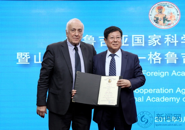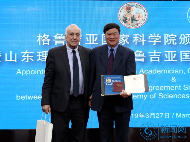 本网讯 3月27日下午,在杏园宾馆北楼二层会议室,我校隆重举行格鲁吉亚国家科学院颁发外籍院士证书暨山东理工大学—格鲁吉亚国家科学院合作签约仪式。格鲁吉亚国家科学院院长格奥尔基·科维谢塔兹院士为我校张铁柱教授、兰玉彬教授颁发外籍院士证书,并与我校共同签署山东理工大学—格鲁吉亚国家科学院合作协议。山东理工大学与格鲁吉亚国家科学院联合成立丝路研究院,由此迈出“一带一路”建设新的步伐。