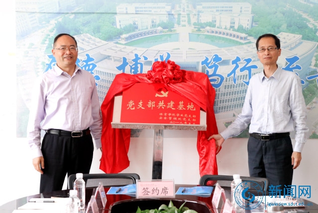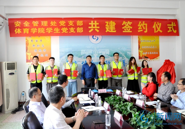 党员代表发言后,双方签署共建协议并互赠纪念品。安全管理处为“学生党员校园卫士”颁发聘书。安全管理处、体育学院负责人为共建基地揭牌。