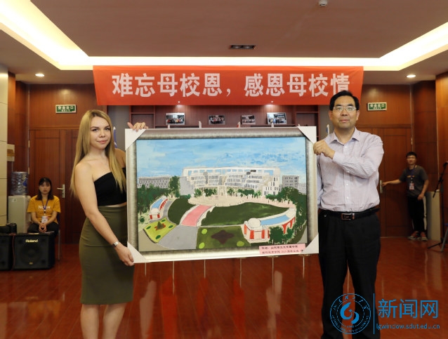 吕传毅代表学校接受了即将毕业的国际学生代表向学校赠送的手绘学校风光作品。他深情地说:“我们将把这幅作品悬挂在学校显眼位置,让在校学生都能够看到,都能够感受到你们对学校的深厚感情!”