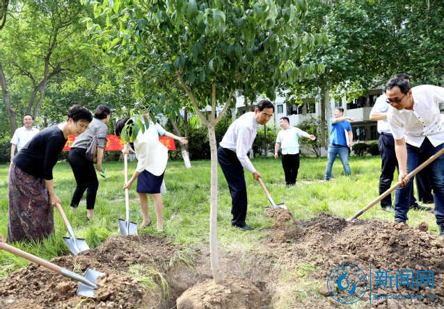 在欢快的气氛中,校领导和校友共同种下大叶丝棉木样品苗,并培土浇水。
