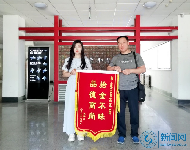 本网讯 6月10日上午,张店区市民王春光来到我校美术学院,将一面绣有“拾金不昧 品德高尚”字样的锦旗送到国画1601班施雪玲同学手中,对她拾金不昧的高尚行为表示感谢,并对学校培养出乐善助人的优秀学生表示赞许。