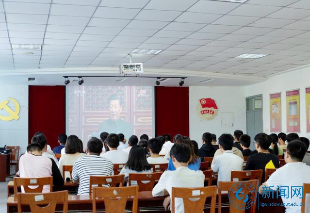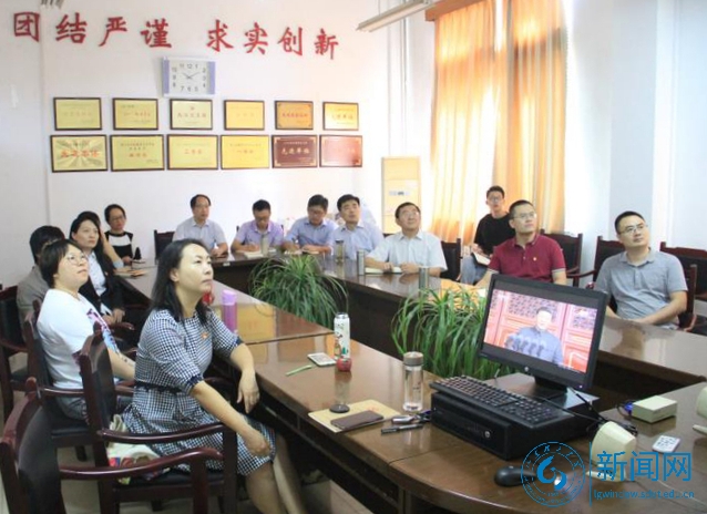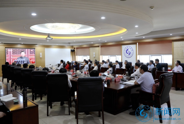 在鸿远楼九楼会议室,校党委理论学习中心组成员集体收看。