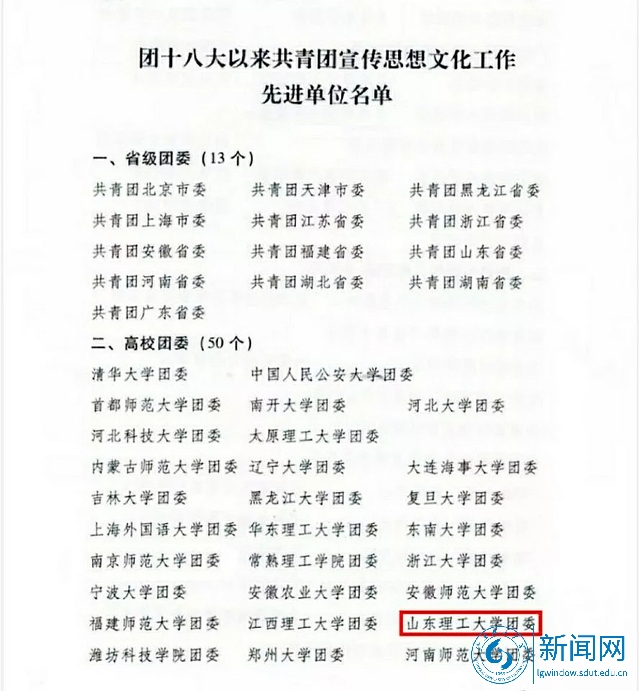 本网讯 近日,共青团十八届三中全会召开,全面总结党的十八大以来共青团宣传思想文化工作,并对团十八大以来共青团宣传思想文化工作先进单位进行通报表扬,我校团委获得全国“团十八大以来宣传思想文化工作先进单位”荣誉称号。全国共50所高校团委获得表彰,山东省仅有2所高校获此殊荣。