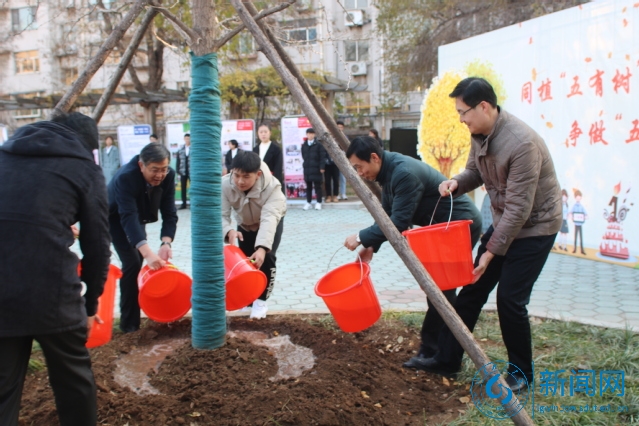 张祥云与大家共同为“五有树”培土浇灌。与此同时,学生为学校公益林浇水,庆祝“五有树”种植一周年。