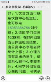 做好留校学生服务。为留校学生发放体温计、口罩、消毒液,严格控制外出,严格落实“日报告、零报告”制度。与饮食服务中心对接,保障留校学生饮食。辅导员、楼管员每天与学生保持联系,了解学生思想状况,为学生送去温暖。