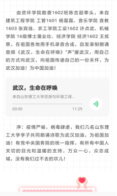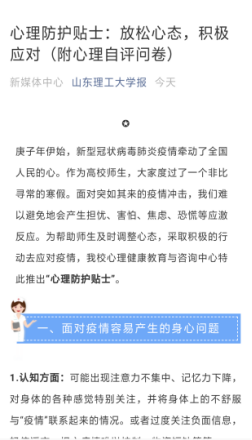 大众网·海报新闻讯 新型冠状病毒感染的肺炎疫情发生以来,山东理工大学学生工作系统认真贯彻落实上级疫情防控决策部署,把学生生命安全和身体健康放在首要位置,把疫情防控作为当前学生工作首要政治任务,统一思想,多措并举,强化落实,扎实推进学生疫情防控和思想政治教育工作,以实际行动诠释使命担当。