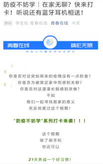 丰富居家防疫生活。策划开展既有意思又有意义的活动,引导学生多学习、多读书、多锻炼、多劳动、多感受家庭温暖。学生工作处发起“防疫不妨学”21天系列打卡活动,组织辅导员撰写网文,引导学生科学合理规划假期。学院充分发挥辅导员、专业教师、学生骨干的特长创作微课,教授学生朗诵技巧、居家健身方法,指导学生开展专业学习。