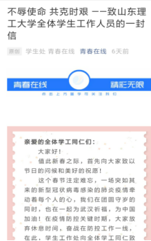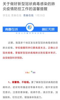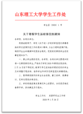 疫情发生后,全体学生工作人员立即进入工作状态,先后发布《关于防控新型冠状病毒感染肺炎的温馨提醒》《关于寒假学生返校事宜的通知》《关于推迟2020年春季学期开学的通知》《我们在稷下湖畔等你们——致山理工湖北籍同学的一封信》,告知全体学生高度重视疫情,做好个人防护,严禁提前返校,理性对待疫情,不恐慌、不造谣、不信谣、不传谣。第一时间向256名湖北籍学生送去学校关怀,第一时间对留校学生加强保护,第一时间对学生公寓启动最严管理。