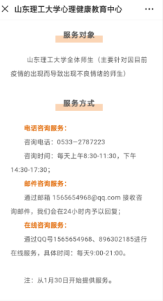 开展心理支持服务。心理健康教育与咨询中心组织专职教师、心理辅导员、班级心理委员组建心理援助团,通过电话、邮件以及QQ在线等方式,面向全校师生开展针对因疫情所引发的恐慌、抑郁、焦虑等各类心理困扰的心理支持与服务。
