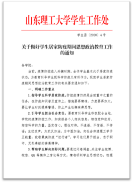 学生工作处根据学校疫情防控应急预案,制定《防控新型冠状病毒感染的肺炎疫情学生工作方案》,对假期和开学前后的疫情防控工作细化措施,责任到人。发布《关于做好疫情防控期间学生公寓管理工作的通知》,对楼宇管理、人员管理、留宿学生管理、卫生管理提出要求,确保公寓安全。发布《不辱使命 共克时艰——致山东理工大学全体学生工作人员的一封信》,号召全体学生工作人员提高政治站位,严肃工作纪律,落实重点工作,做好个人防护。发布《关于做好学生居家防疫期间思想政治教育工作的通知》,充分挖掘疫情防控中的思政资源,教育引导学生既科学防疫又有所作为。