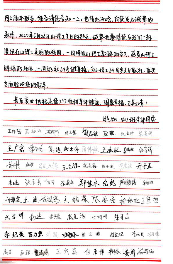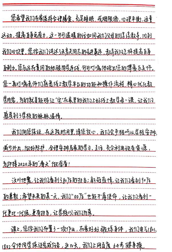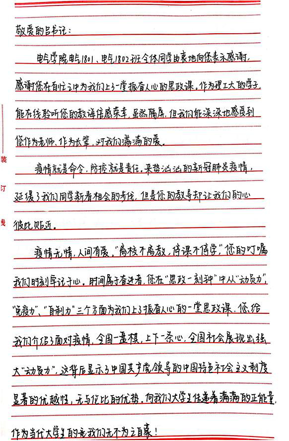 3月2日,我校2020年春季学期线上开课第一天,吕传毅为电气与电子工程学院电气1801、1802班学生上“思政一刻钟”,他结合疫情防控,用小切口讲大道理。授课时间虽然很短,但却字字饱含深情,句句振奋人心。电气1801、1802班全体同学在线聆听了吕传毅书记的亲切教诲,感受到了满满的爱和正能量。当天,班级同学集体决定,通过信件的形式,向吕书记表达感谢,感谢吕书记让学生们认识和感受到疫情抗击背后祖国强大的凝聚力和战斗力,感谢吕书记作为老师和长辈对同学们满满的关心、爱护和牵挂。