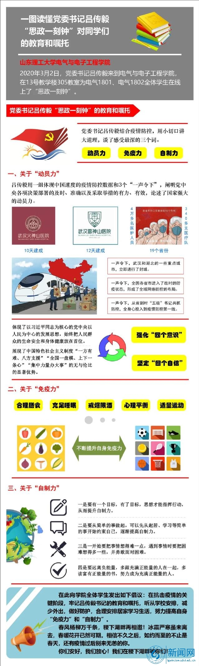 为更好地学习和牢记吕传毅书记的教育和嘱托,电气学院绘制了“一张图读懂吕传毅书记‘思政一刻钟’对同学们的教育和嘱托”,并在全院学生中发起倡议:谨记吕书记的嘱托,争做“五有”人才。