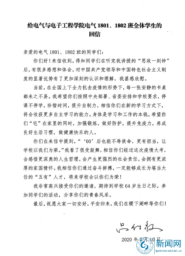 本网讯 3月10日,校党委书记吕传毅给电气与电子工程学院电气1801、1802班同学回信,勉励他们停课不停学,锻炼好身体,拥有更浓厚的家国情怀,成长为堪当大任的“五有”人才。
