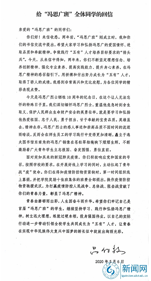 吕传毅书记的回信在“冯思广班”全体学生中引起热议。同学们纷纷表示,“我们会进一步学习发扬冯思广热爱祖国,忠于人民、勇于担当、甘于奉献的宝贵品质,用青春之我创造青春之中国、青春之民族”“我们一定不断坚定理想信念、培养创新精神、强化专业素养、提高实践能力、提升身心素养,争做‘五有’人才培养目标的排头兵和勇担民族复兴大任的新时代青年”。