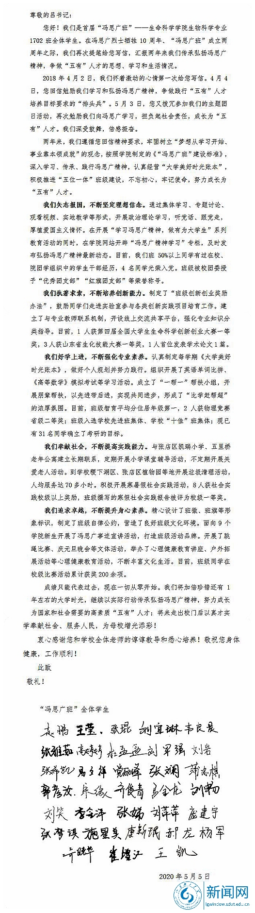 “冯思广班”学生致吕书记的信全文如下: