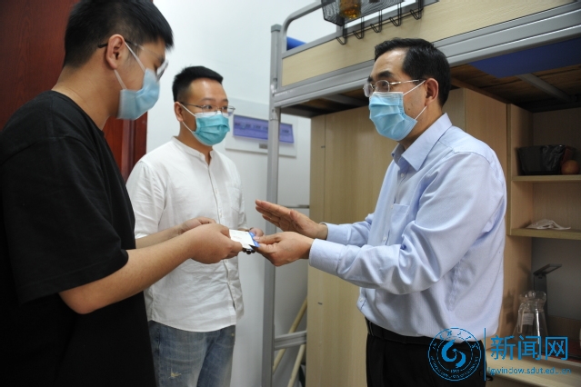吕传毅还向两位同学发放了研究生院统一准备的含有防疫手册、防疫物资的大礼包。在感受到学校领导的贴心暖心关爱后,两位同学心情激动。他们拿出校报社赠送的明信片,请吕传毅书记题字留念。
