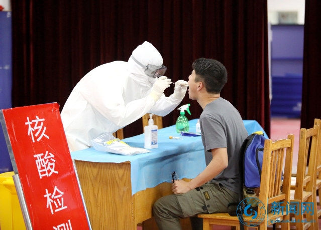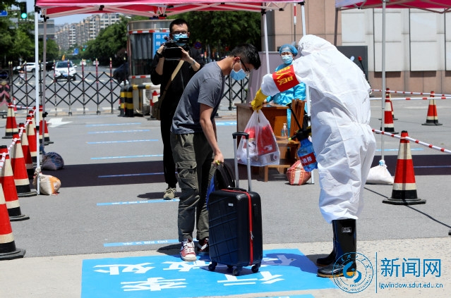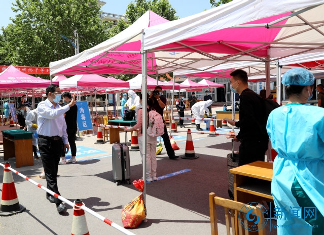 体温检测、行李箱消毒、手部消毒、更换口罩、查看返校二维码和校园卡、核验山东健康通行码、收取“六类重点人群”合格材料、省外学生进行核酸和血清抗体检测……进校的各环节有条不紊地进行着,学生相隔1.5米依次排队,秩序井然。