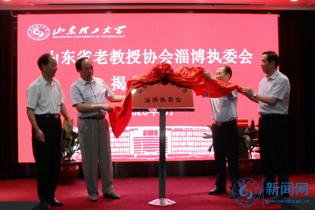 毛有高、赵彦修、吕传毅、都光珍共同为山东省老教授协会淄博执委会揭牌。
