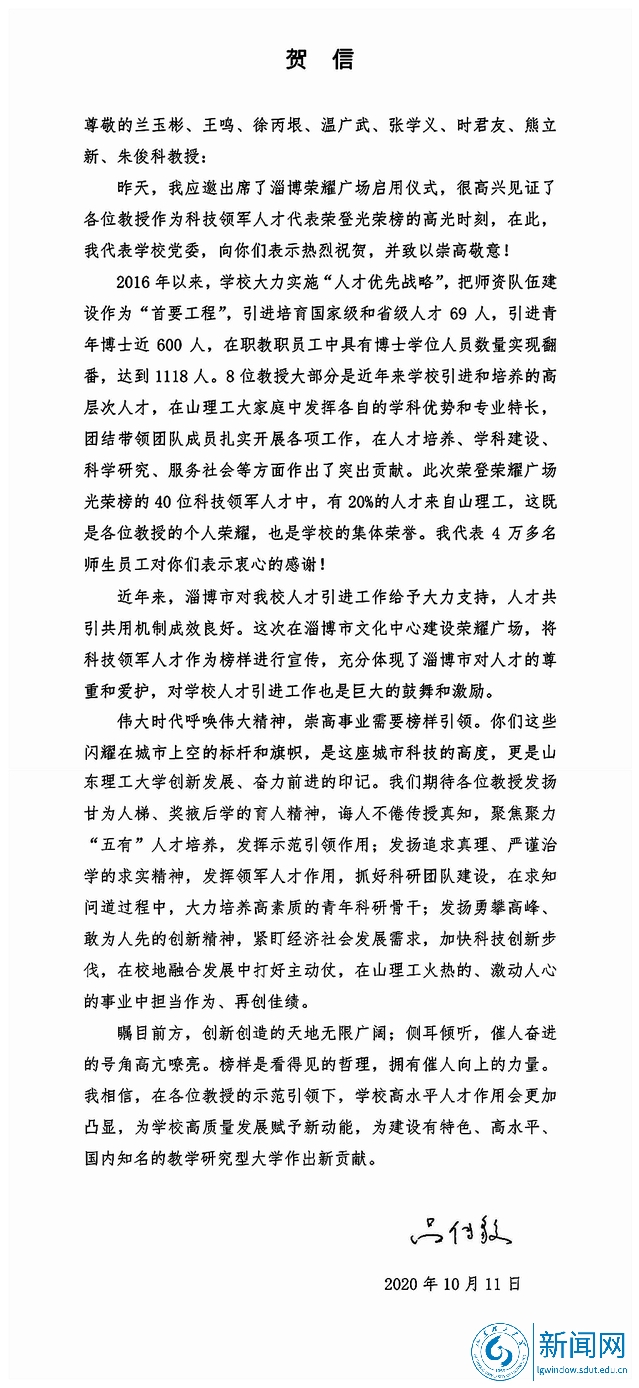 校党委书记吕传毅应邀出席淄博荣耀广场启动仪式,见证了8位教授作为领军人才代表荣登光荣榜的高光时刻,并专门给教授们写了贺信,代表学校党委,向他们表示热烈祝贺,并致以崇高敬意。