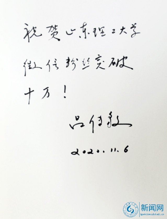在新媒体工作室,吕传毅说:“你们编辑推出的每一条山东理工大学微信、山东理工大学报微信,我都仔细看,我是你们的忠实粉丝。”听到学校官微粉丝数已突破十万,吕传毅欣然题词:“祝贺山东理工大学微信粉丝突破十万!”