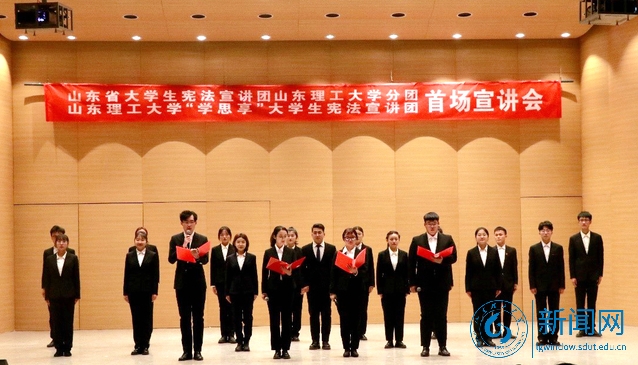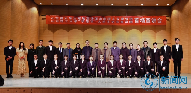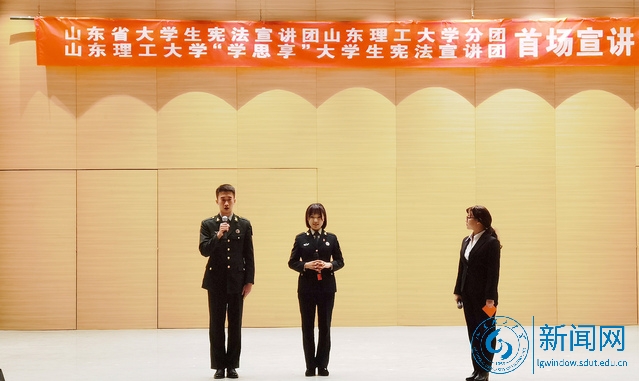 本网讯 12月4日我国第七个国家宪法日当日晚,山东省大学生宪法宣讲团山东理工大学分团——“学思享”大学生宪法宣讲团成立仪式暨首场宣讲会,在音乐学院音乐厅举行。校党委常委、副校长苏守波,省教育厅政策法规处副处长夏贞鹏出席,学校相关部门负责人,法学院领导班子成员、学生代表参加活动。