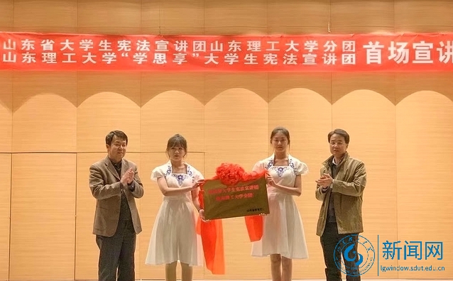 苏守波、夏贞鹏为“山东省大学生宪法宣讲团山东理工大学分团”揭牌。