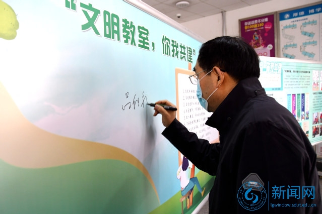 启动仪式后,吕传毅、查玉喜一行和社团学生代表共同在“文明教室,你我共建”倡议展板签名,并合影留念后,到教室观看了“五有”人才主题海报,指导志愿者开展活动。