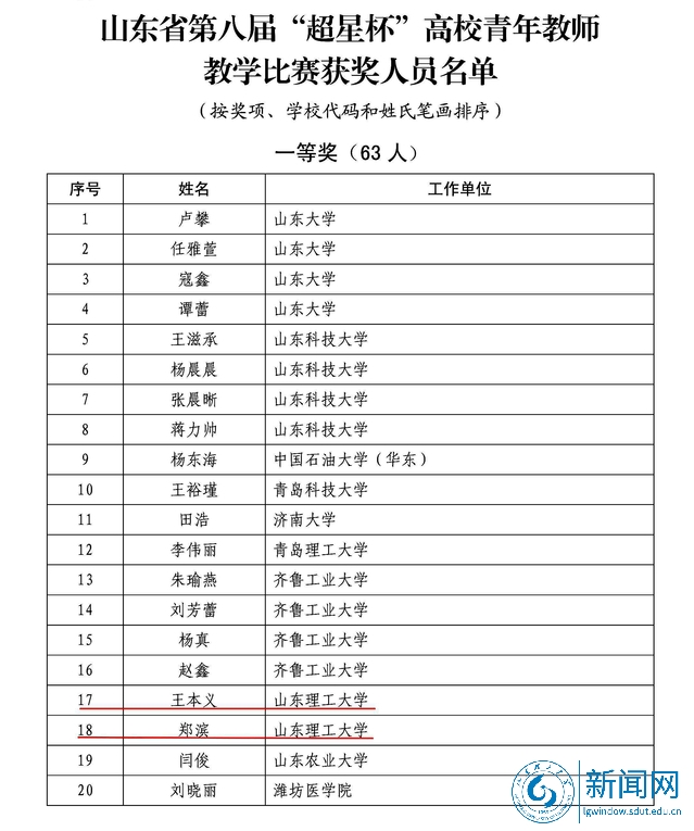 本网讯 6月13日,由山东省教育厅、中国教育工会山东省委员会联合主办,山东省高等学校师资培训中心承办的第八届“超星杯”高校青年教师教学比赛决赛成绩揭晓,我校参赛教师全部获奖,其中,物理与光电工程学院王本义、数学与统计学院郑滨荣获一等奖,农业工程与食品科学学院贾鹏荣获二等奖,体育学院卢海龙等5位教师荣获优秀奖,学校获优秀组织奖,再创我校在该项比赛中的历史最好成绩。