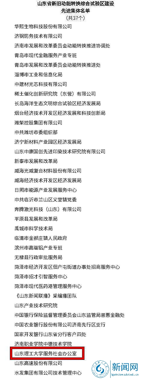 本网讯 近日,省委、省政府印发《关于表彰山东省新旧动能转换综合试验区建设先进集体和先进个人的通报》,我校服务社会办公室喜获“山东省新旧动能转换综合试验区建设先进集体”称号。