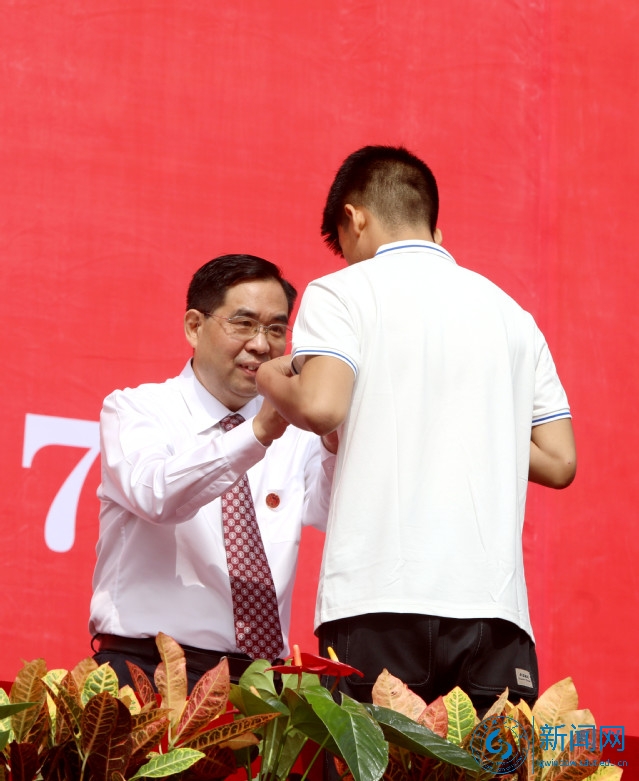 校领导与淄博军分区领导为2021级学生代表佩戴校徽。