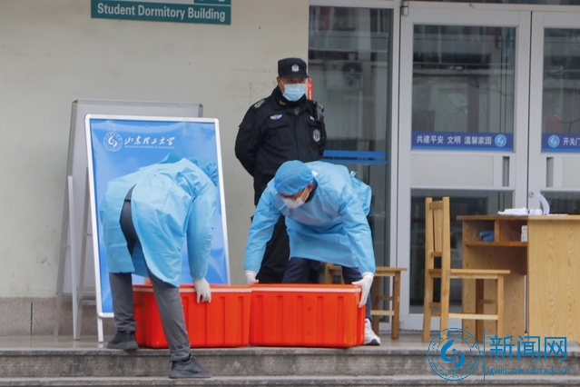 第八个环节是生活物资保障。学生辅导员每日收集封控区、管控区学生生活物资需求计划,统计汇总后交后勤工作组统一采购送货。运输生活物资车辆驶入封控区、管控区域外,后勤消毒组人员对司机进行体温测量、信息登记、对车辆进行消毒。后勤工作人员将食物、物资、快递等进行分类,按需求计划送至封控区、管控区学生宿舍门外,并敲门告知学生5分钟后开门领取物品。