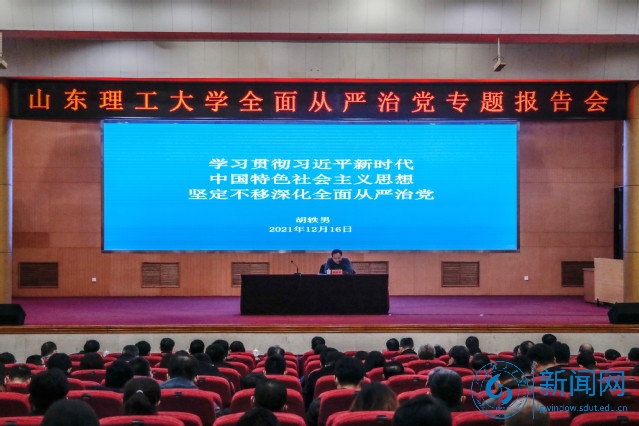 本网讯 12月16日下午,学校举行全面从严治党专题报告会,邀请山东省纪委监委第四监督检查室副主任胡轶男作专题报告。报告会由校党委副书记、校长胡兴禹主持。校领导刘国华、王立斌、魏修亭、查玉喜、易维明、张金生出席,校党委委员、纪委委员,全体中层干部,全体纪检监察干部,各院(系)级单位党组织纪检委员参加报告会。